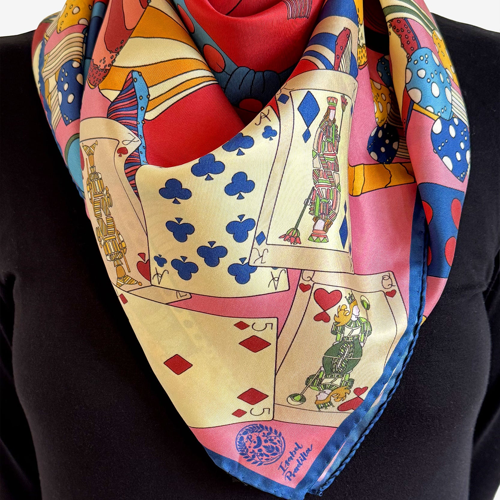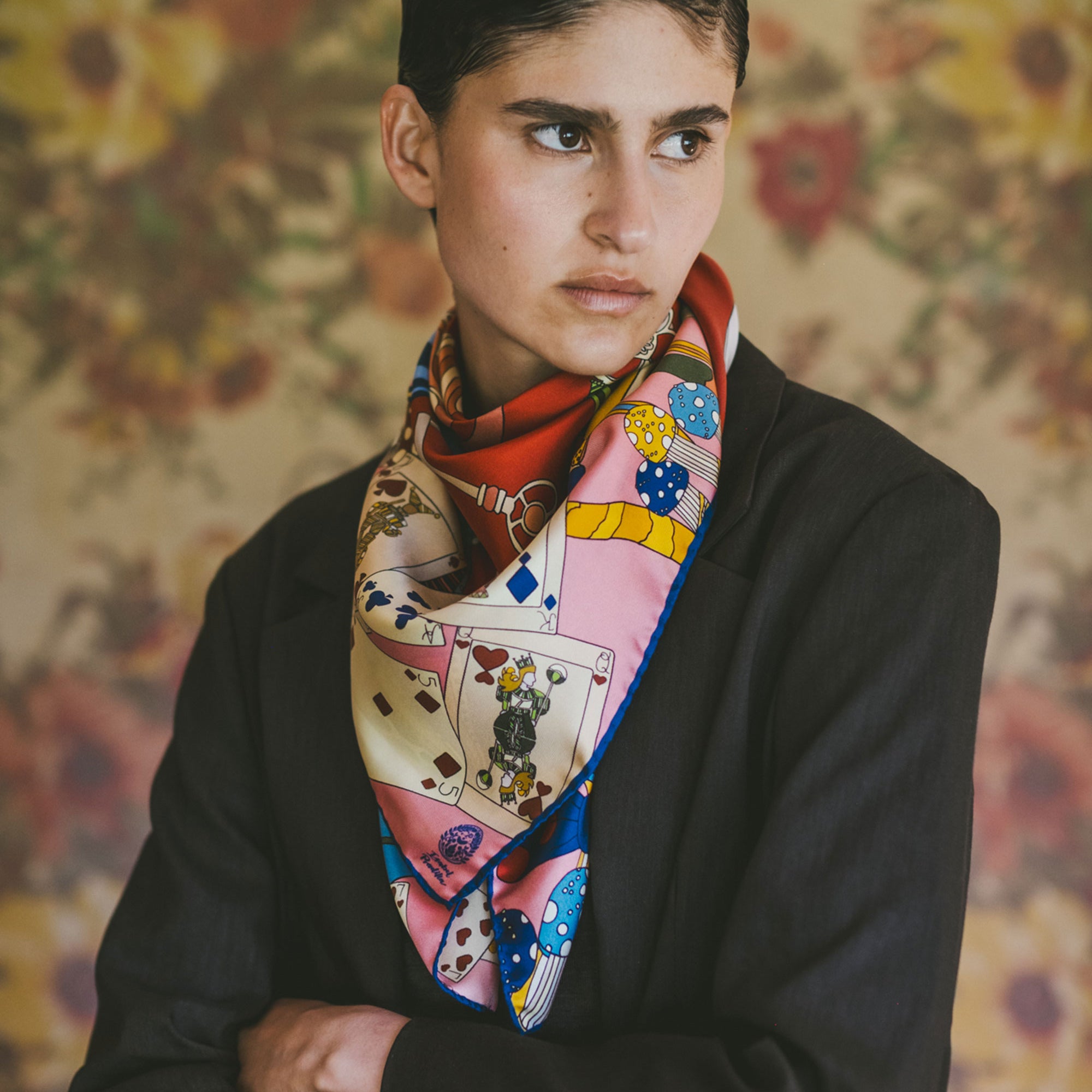 A scarf that invites you to step into Wonderland, where fantasy and delight meet in every fold of silk.
