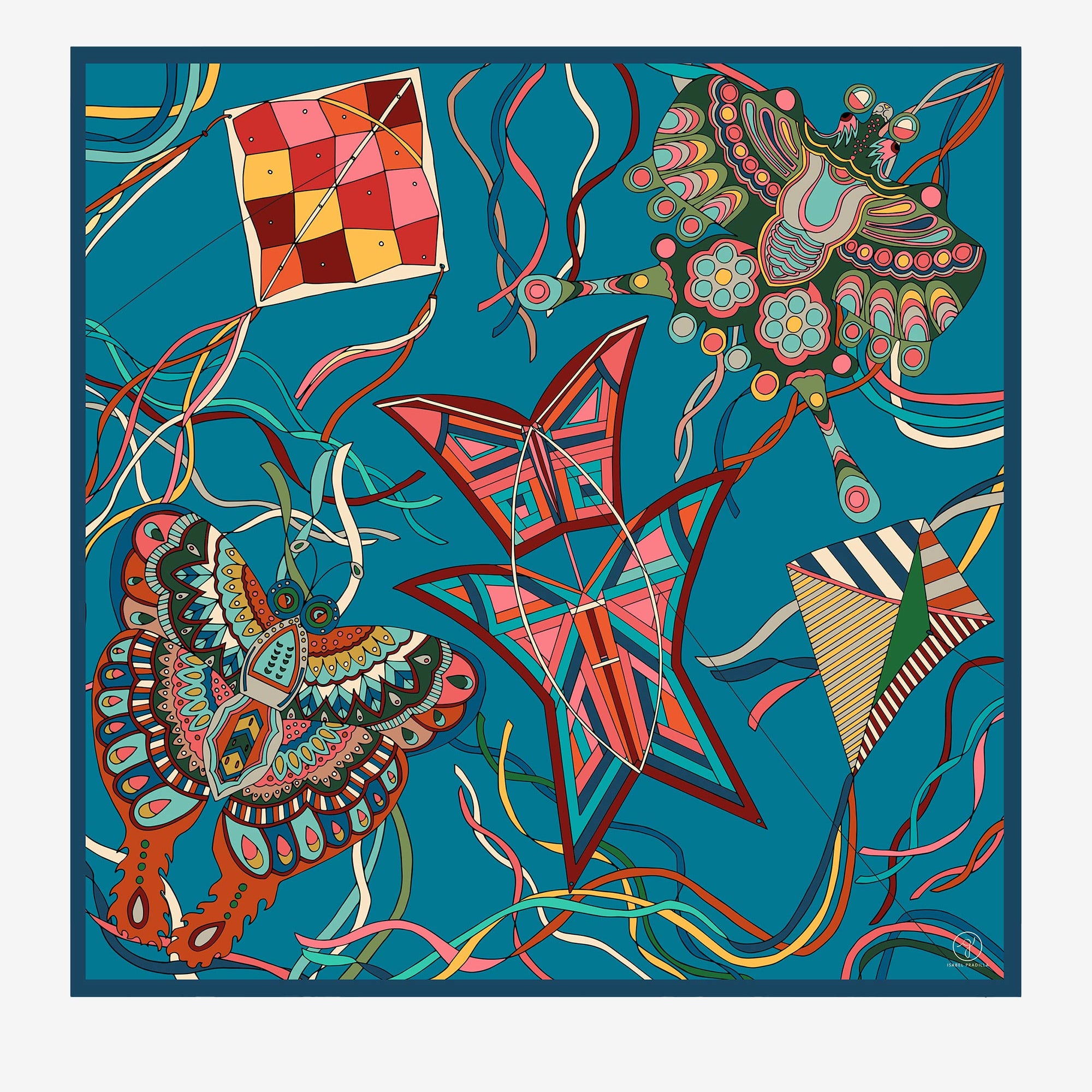 Inspired by Anastasia, one of the many fantastical cities described in Italo Calvino’s Invisible Cities, this scarf reimagines a place where wonder floats in the air and the sky is alive with colour. In Calvino’s story, Anastasia is a city built on dreams and desires—a place where everything feels possible. Translating that vision into silk, this design features a sky filled with hand-drawn kites in playful shapes and vivid hues, drifting freely across the surface.