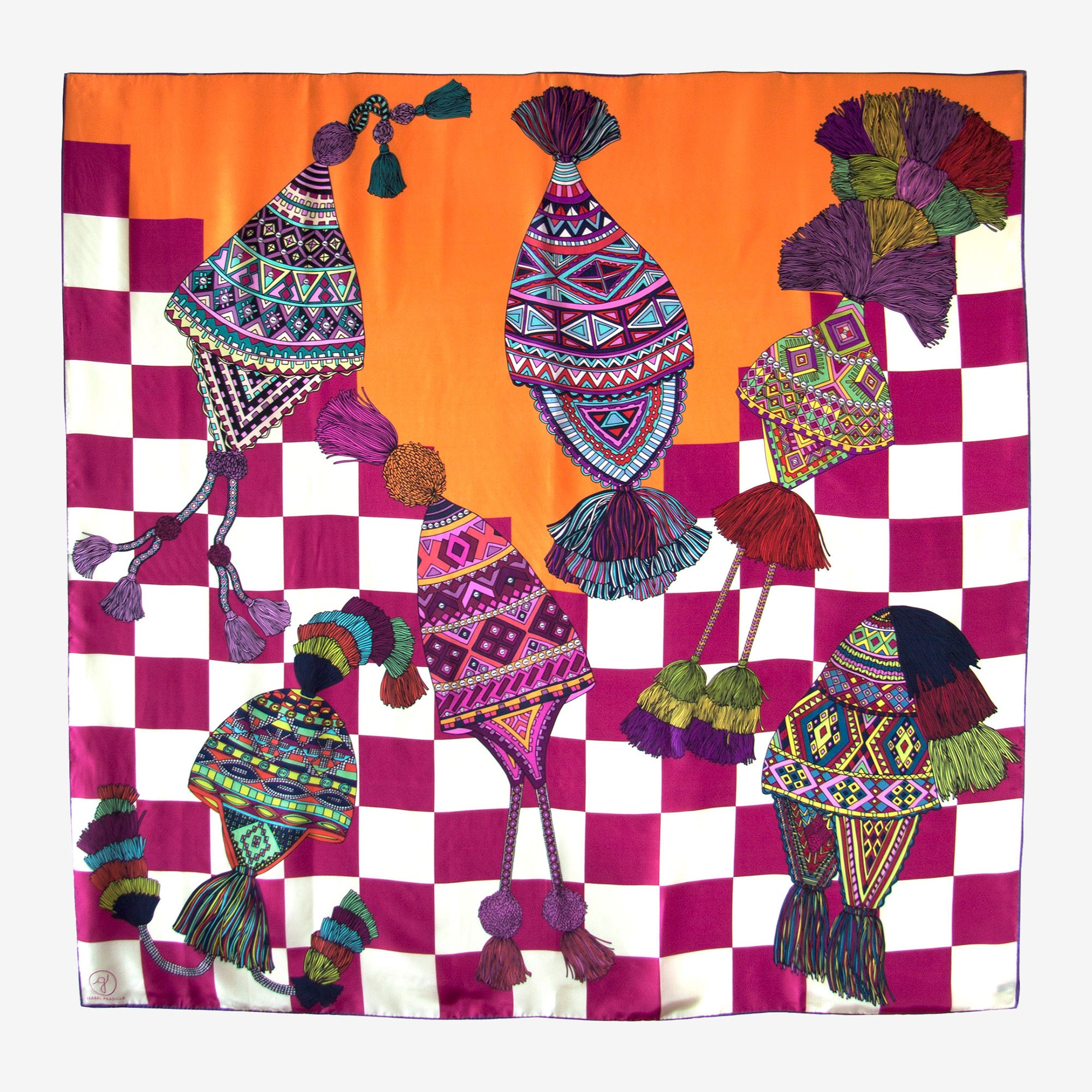 Part of the Kosmos I collection inspired by Alexander von Humboldt’s travels through the Americas, this design celebrates the colorful tradition of Peruvian chullos — the iconic knitted hats. Featuring a lively array of these beautiful hats in vibrant hues, set against a geometric background inspired by Incan textile patterns, it blends heritage with a modern, graphic edge.
