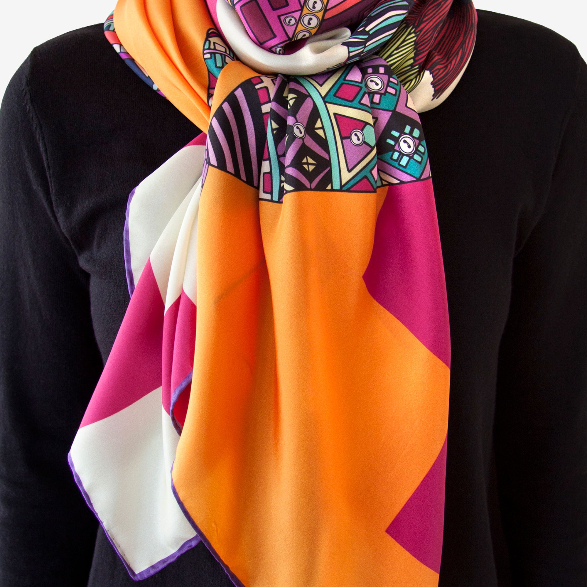 Printed on a generous 136x136cm square of lightweight silk habotai and crafted in the UK, this scarf drapes beautifully and invites versatile styling — perfect for layering or statement looks.