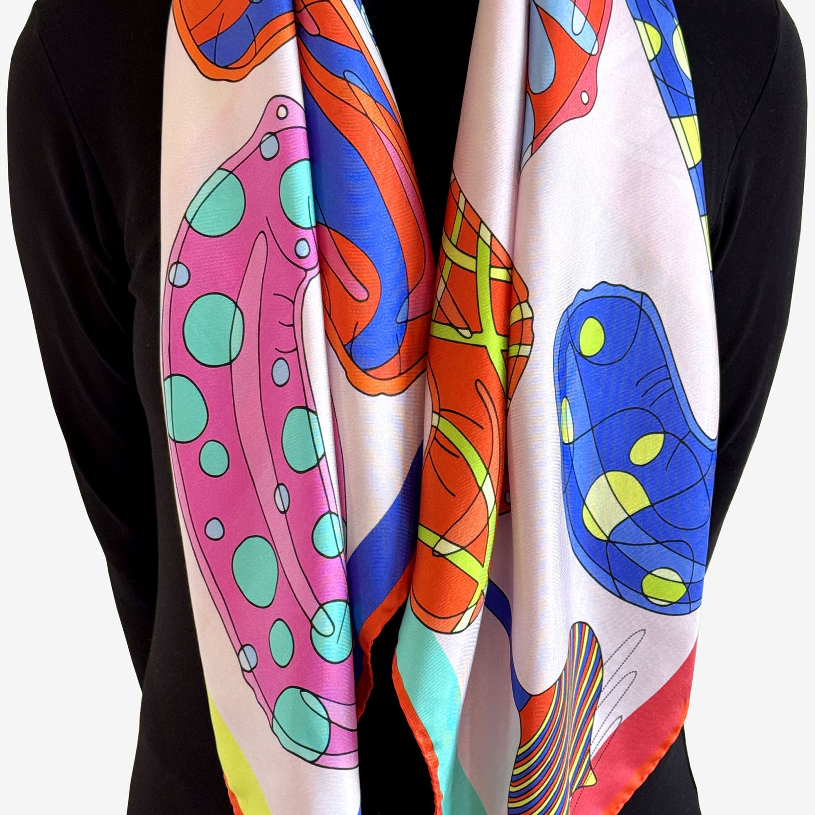 Printed on a classic 90x90cm square of luxurious silk twill and crafted in the UK, this scarf combines a crisp, elegant drape with vibrant, lasting color — perfect for neck, hair, or as a statement accessory.