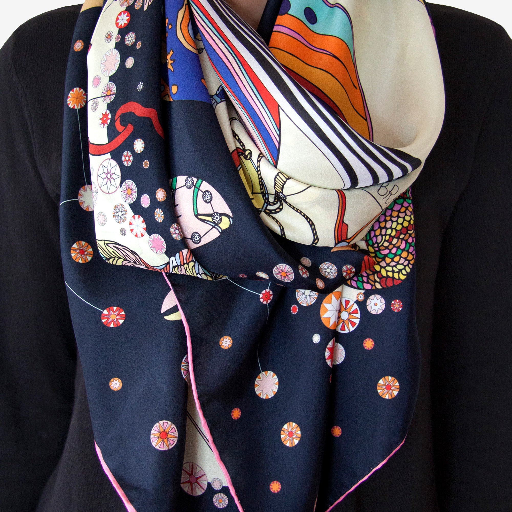 Printed on a generous 136x136cm square of lightweight 100% silk habotai and crafted in the UK, this scarf drapes beautifully and invites versatile styling — perfect for layering or statement looks.