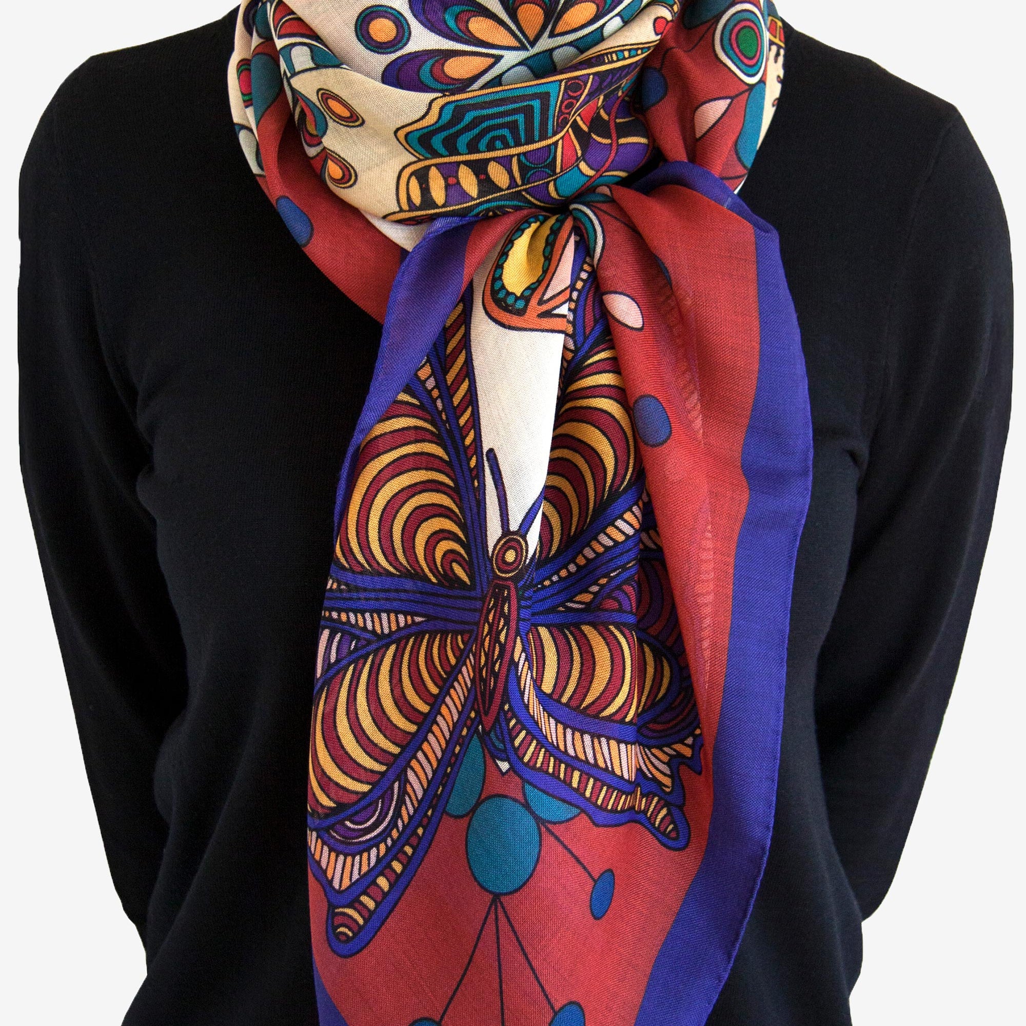 Printed on a generous 134x134cm square of 100% wool and crafted in Italy, this scarf offers a soft, warm drape with a feather-light feel — ideal for wrapping yourself during the colder months.