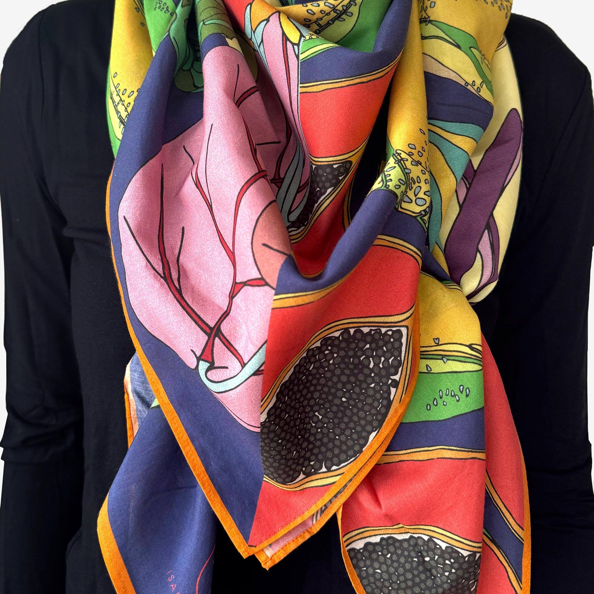 This 136x136 cm scarf is divided diagonally, with two contrasting designs forming a dynamic, reversible composition. Made in the UK from a soft, breathable blend of 65% cotton and 35% silk, it offers endless styling possibilities — fold to highlight one side or blend both for a layered, expressive look.