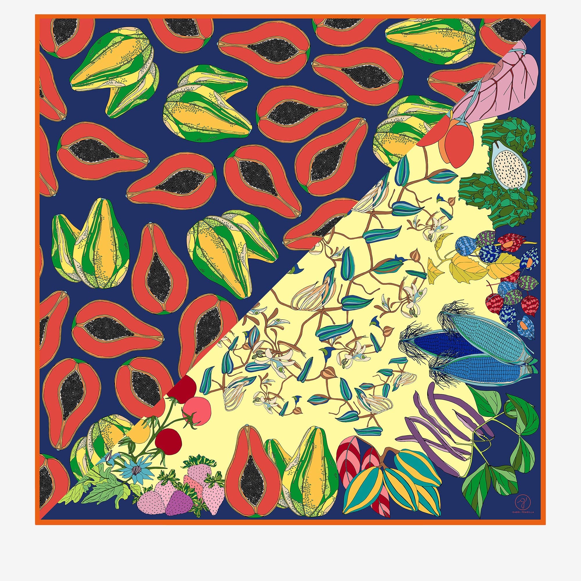 Part of the Kosmos II collection, this design celebrates the native fruits and vegetables of the Americas — from corn and squash to chirimoya, vanilla, and pineapple. Each element is hand-drawn in a vibrant, playful composition that highlights the natural abundance that once captivated explorers and botanists alike.