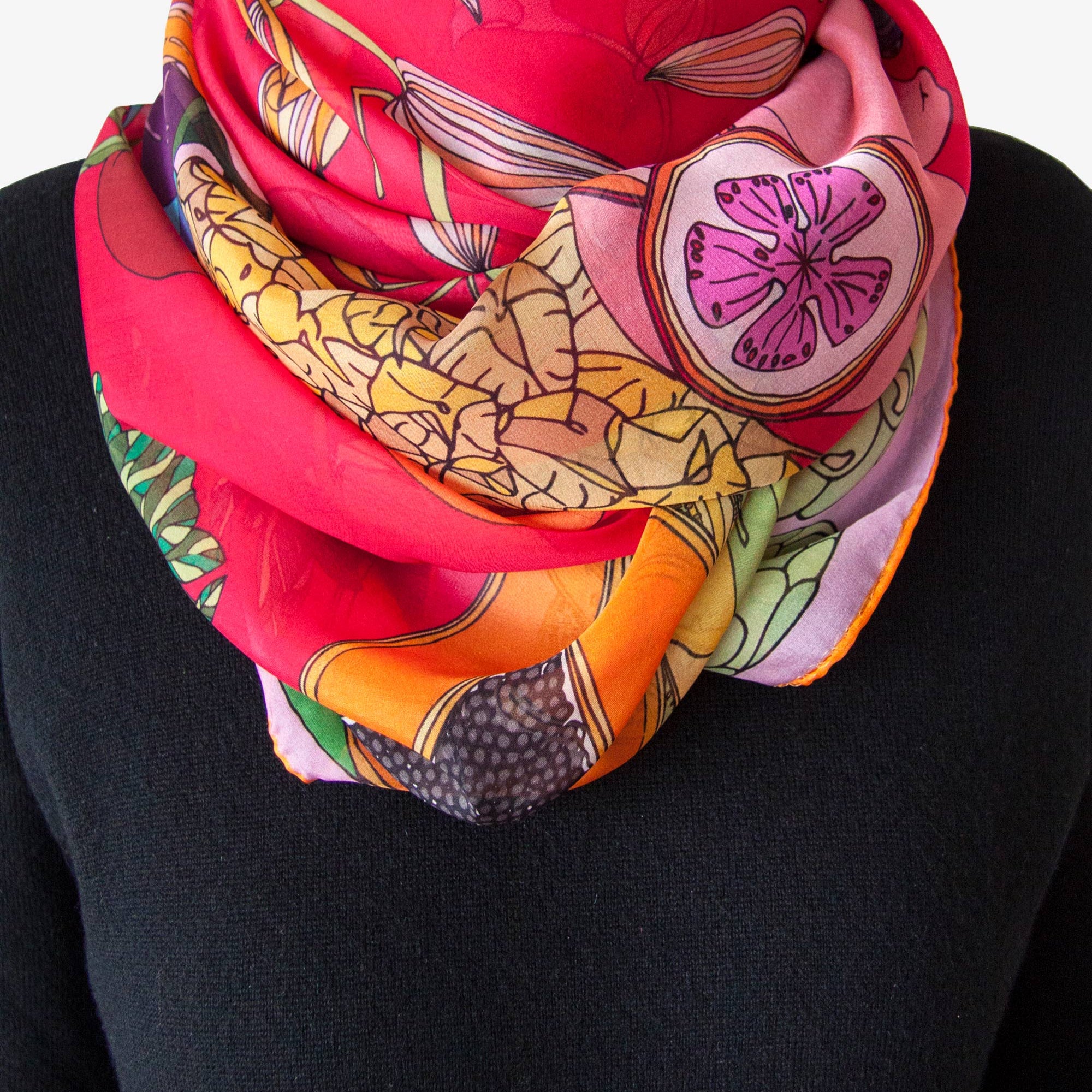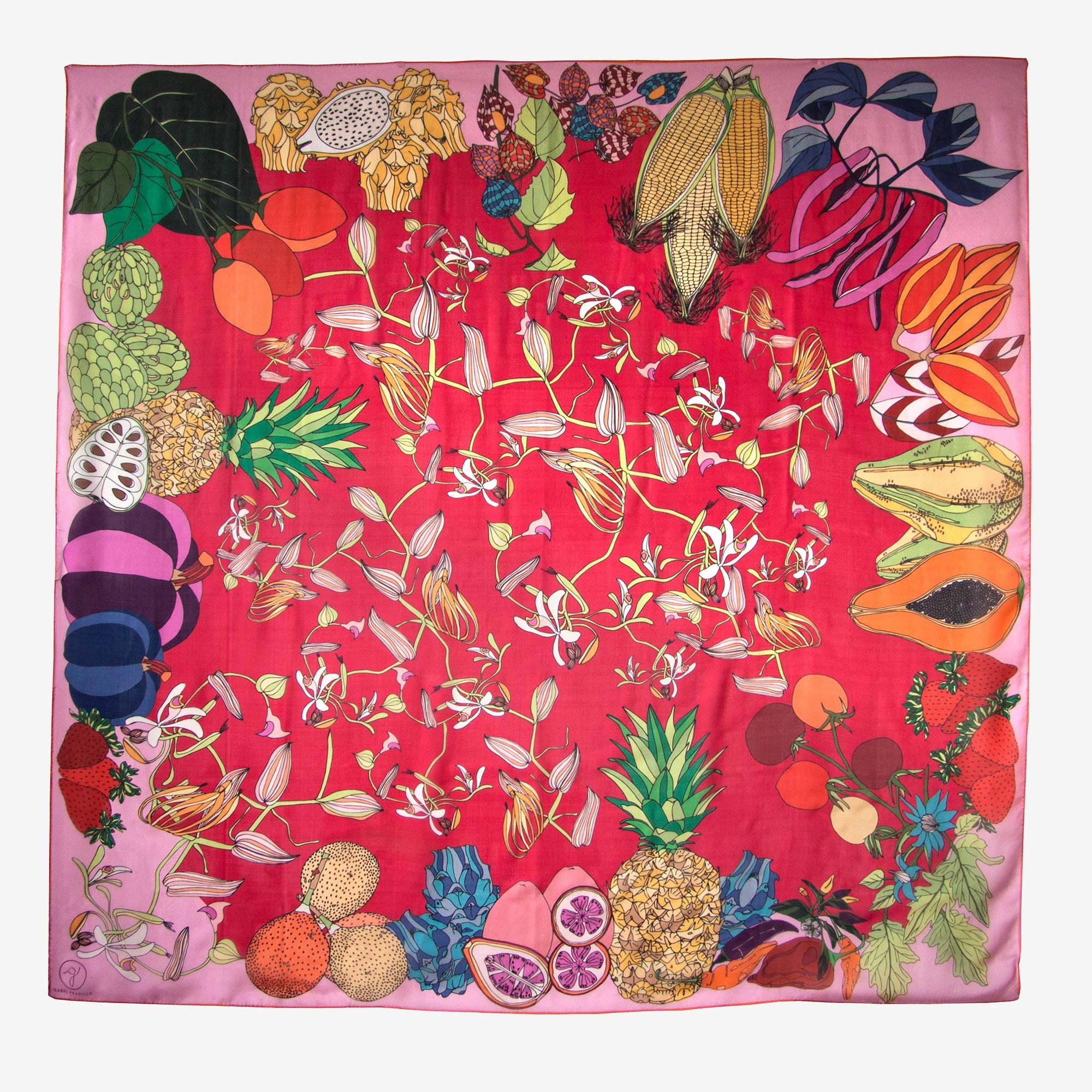 Printed on a generous 136x136cm square of lightweight silk habotai and crafted in the UK, this scarf is a joyful tribute to the origins of the foods we know and love today.