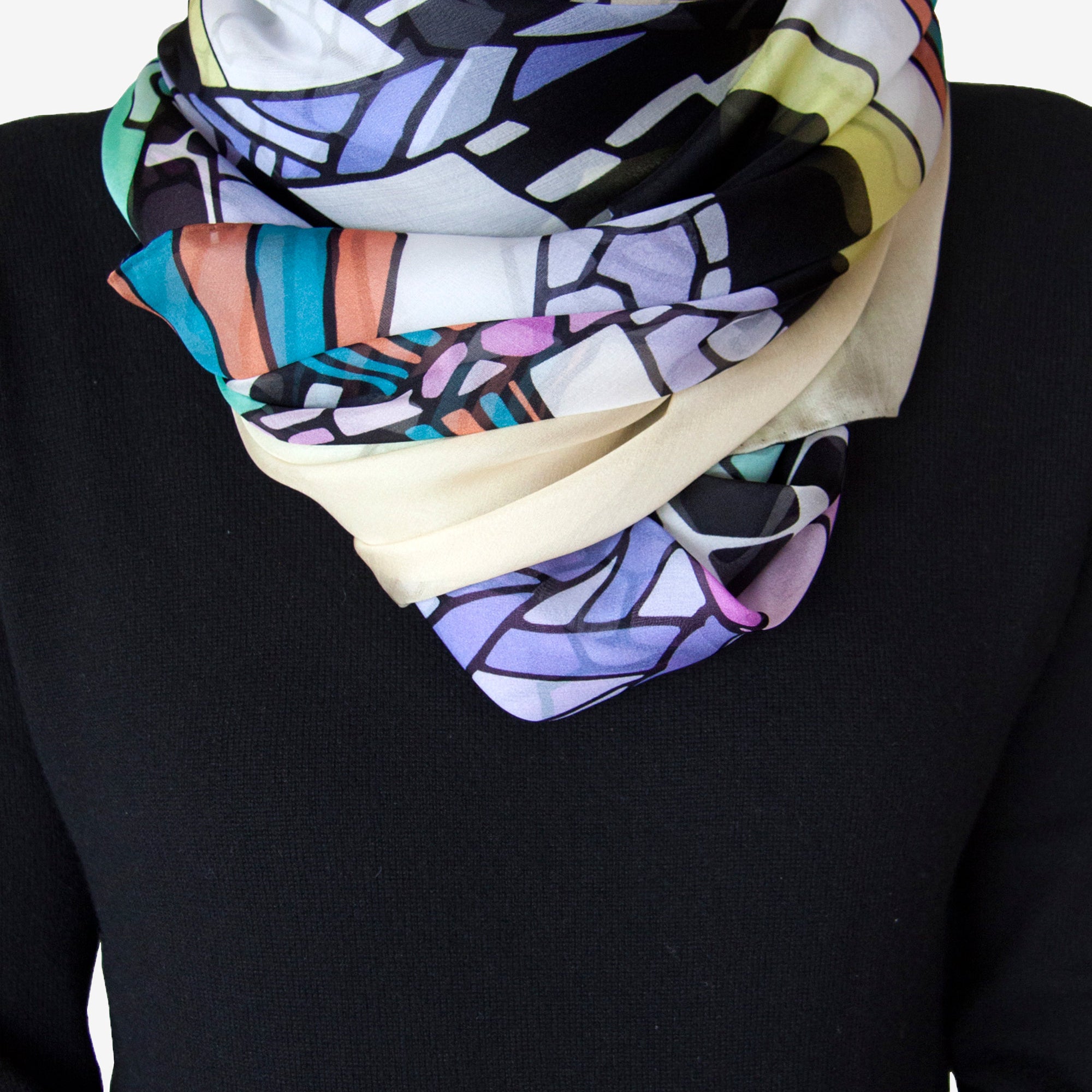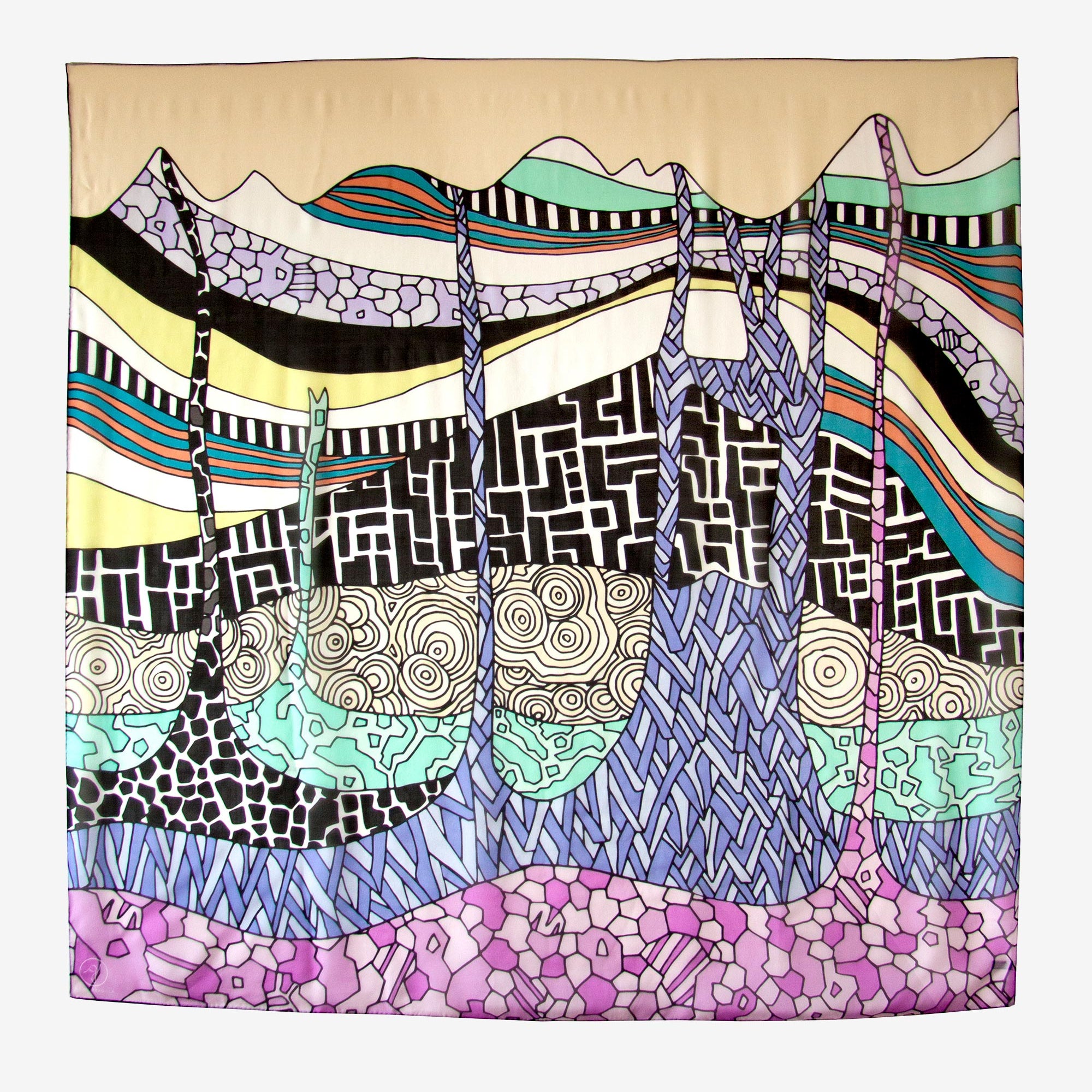 Printed on a 136x136cm square of lightweight silk habotai and crafted in the UK, the scarf offers delicate transparency and graceful movement — a wearable tribute to nature’s deep time and timeless beauty
