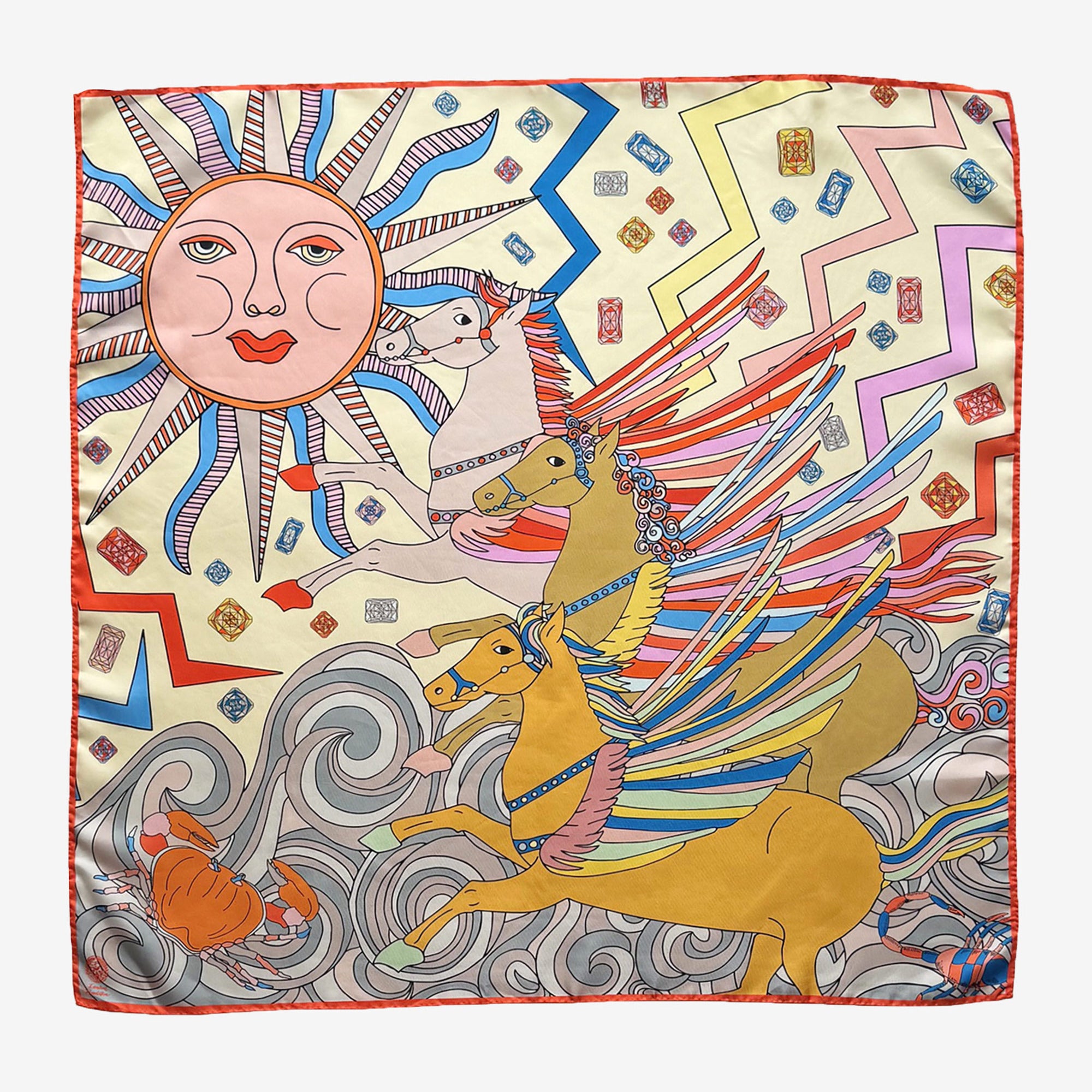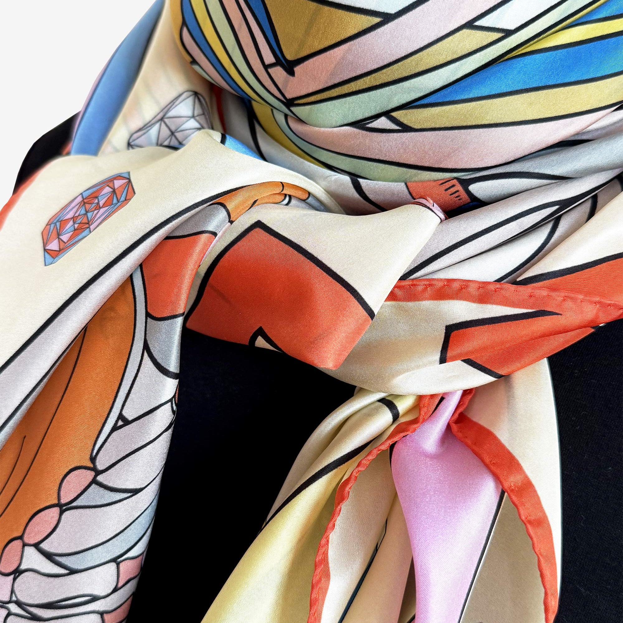 Printed on a generous 136x136cm square of lightweight silk habotai and crafted in the UK, this scarf drapes beautifully and invites creative styling — from shawl to headscarf to flowing top.