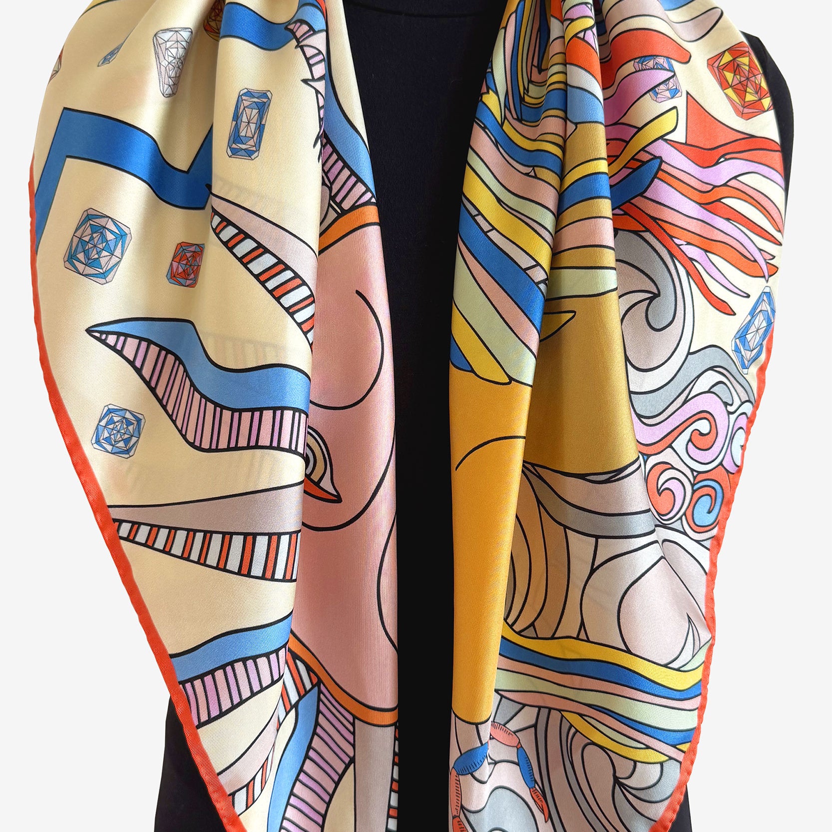 Printed on a classic 90x90cm square of luxurious silk twill and crafted in the UK, this scarf combines a crisp, elegant drape with vibrant, lasting color — perfect for neck, hair, or as a statement accessory.