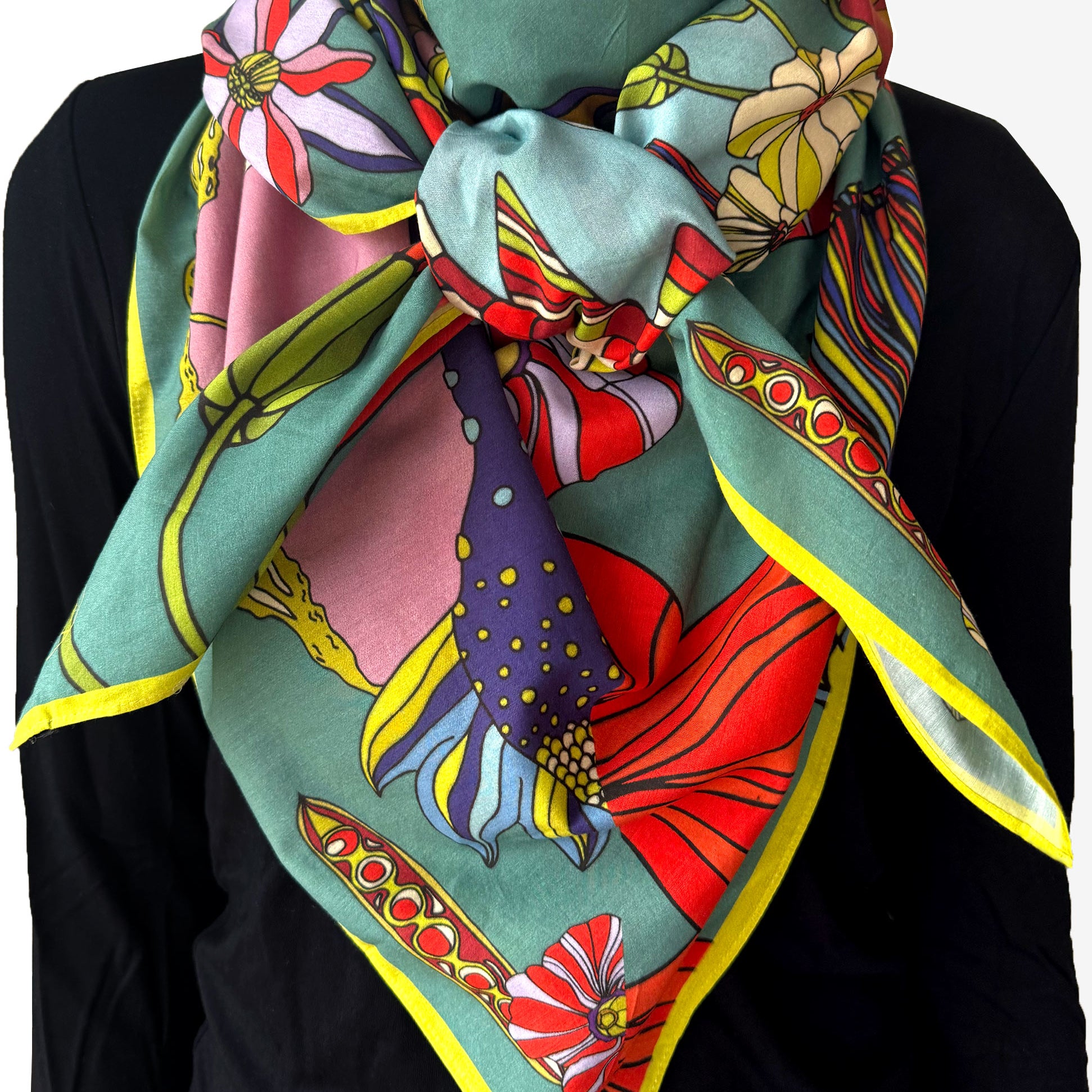 This 136x136 cm scarf is divided diagonally, with two contrasting designs forming a dynamic, reversible composition. Made in the UK from a soft, breathable blend of 65% cotton and 35% silk, it offers endless styling possibilities — fold to highlight one side or blend both for a layered, expressive look.