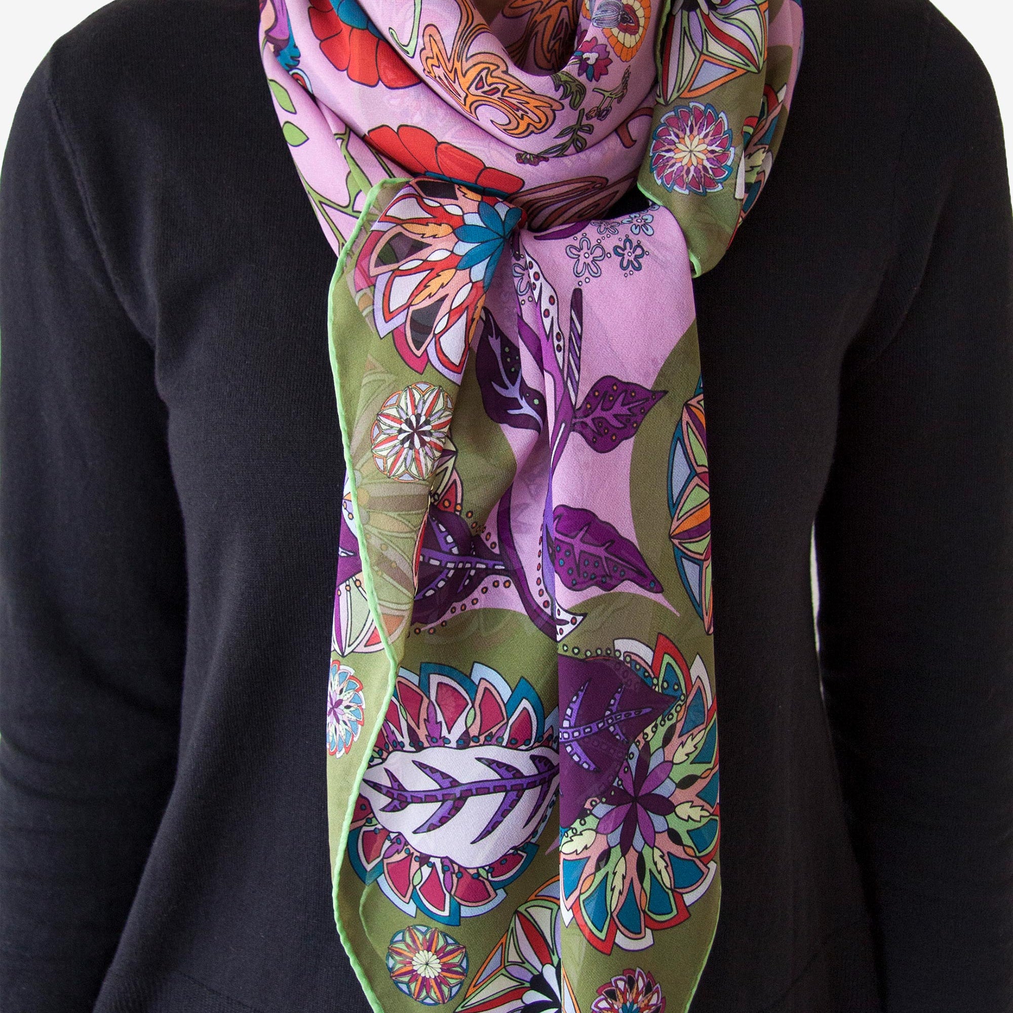 Printed on a 136x136cm square of lightweight silk georgette and crafted in the UK, the scarf offers delicate transparency and graceful movement.