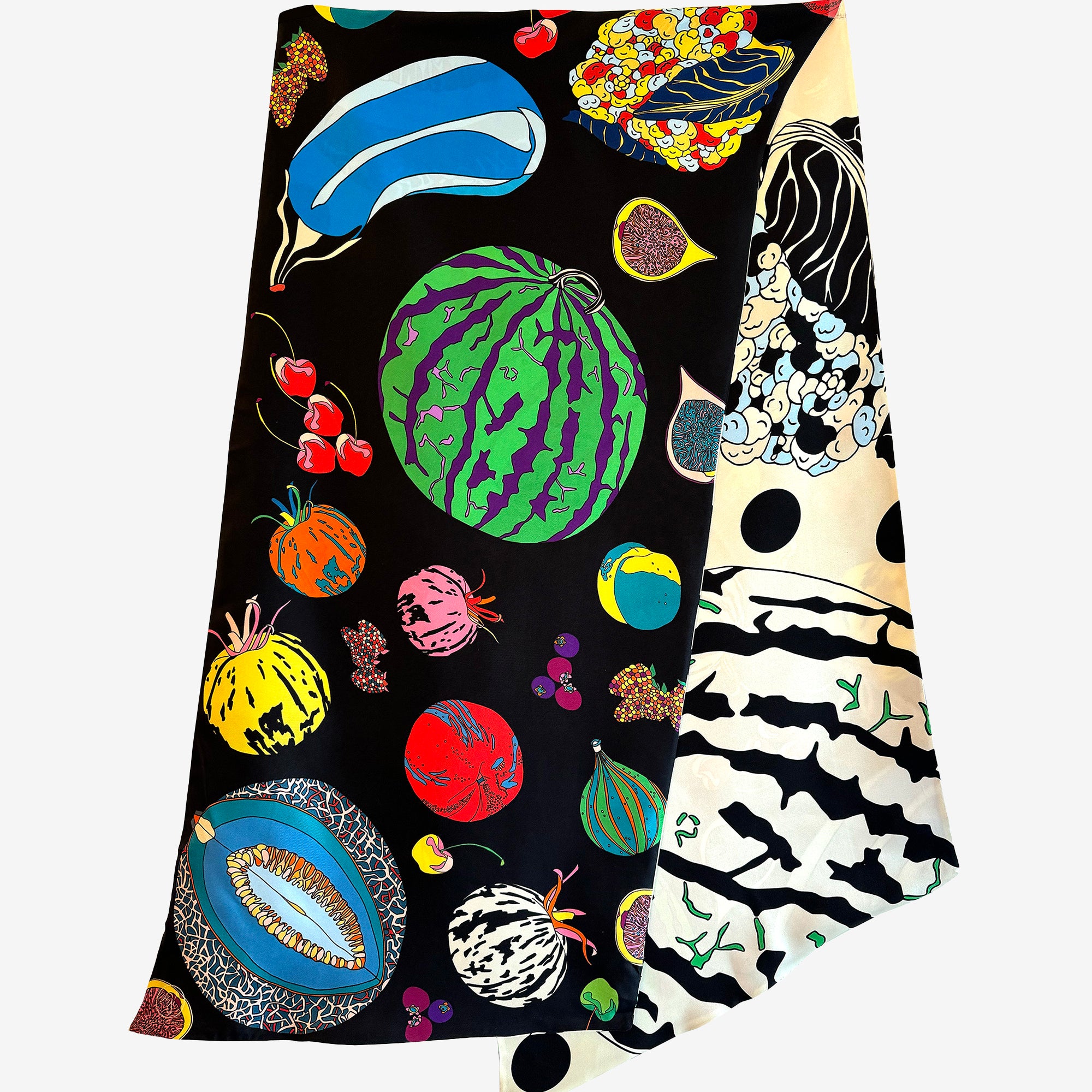 Inspired by Notus, the Greek god of the warm south wind, this double-sided scarf captures the fleeting, sun-drenched essence of summer. Its vibrant, comic-inspired palette bursts with life—illustrating seasonal fruits and vegetables like vivid cherries, ripe tomatoes, and blushing peaches, all swirling together in a joyful whirlwind of color.
