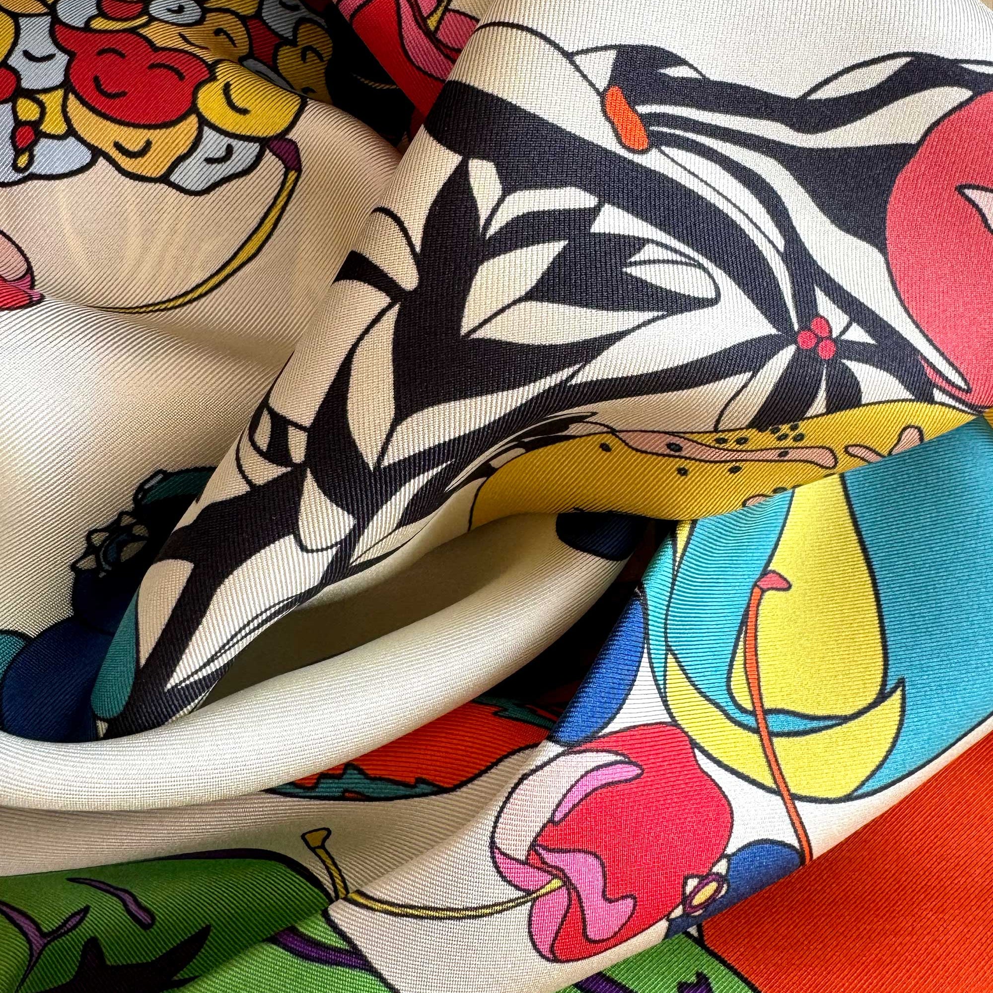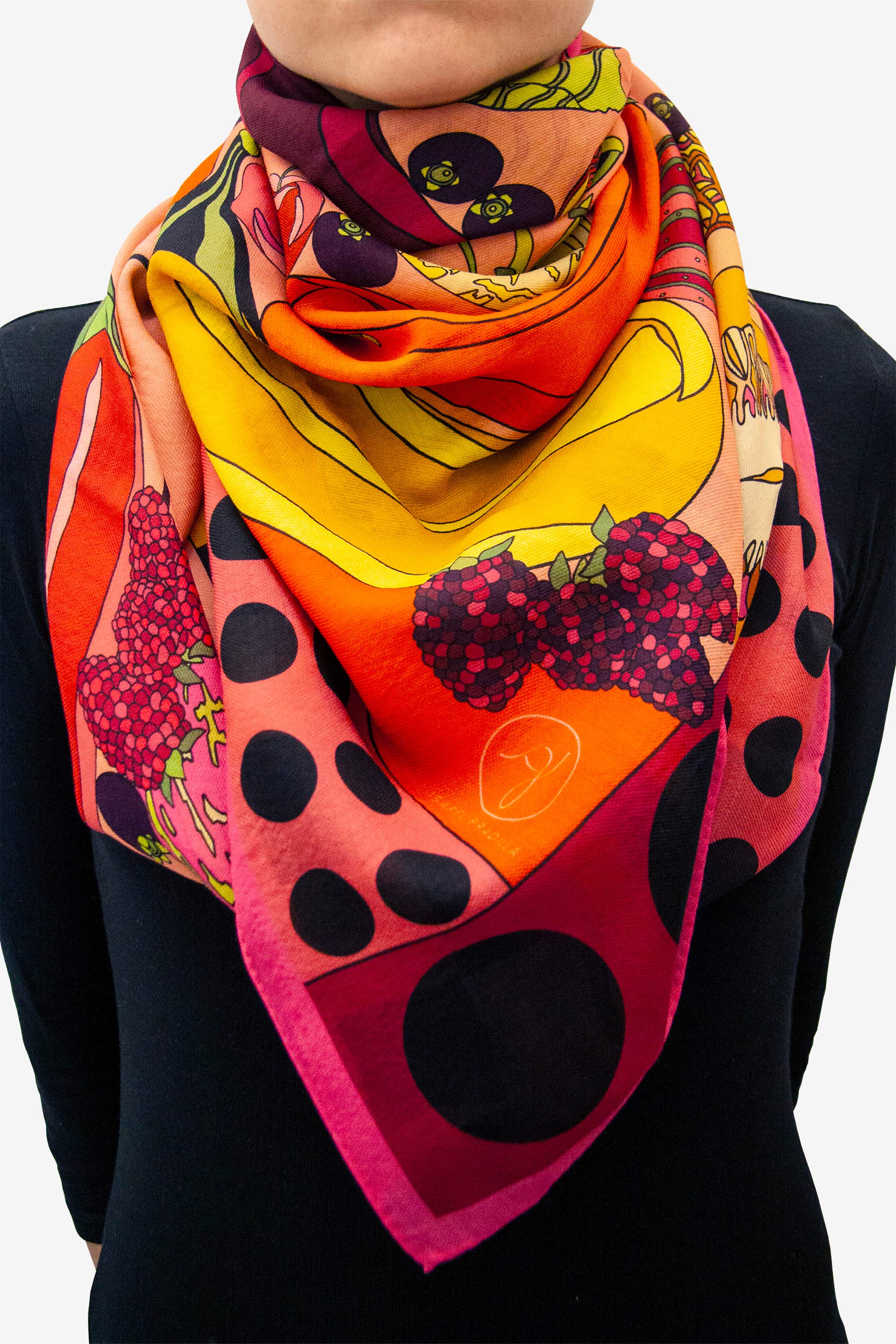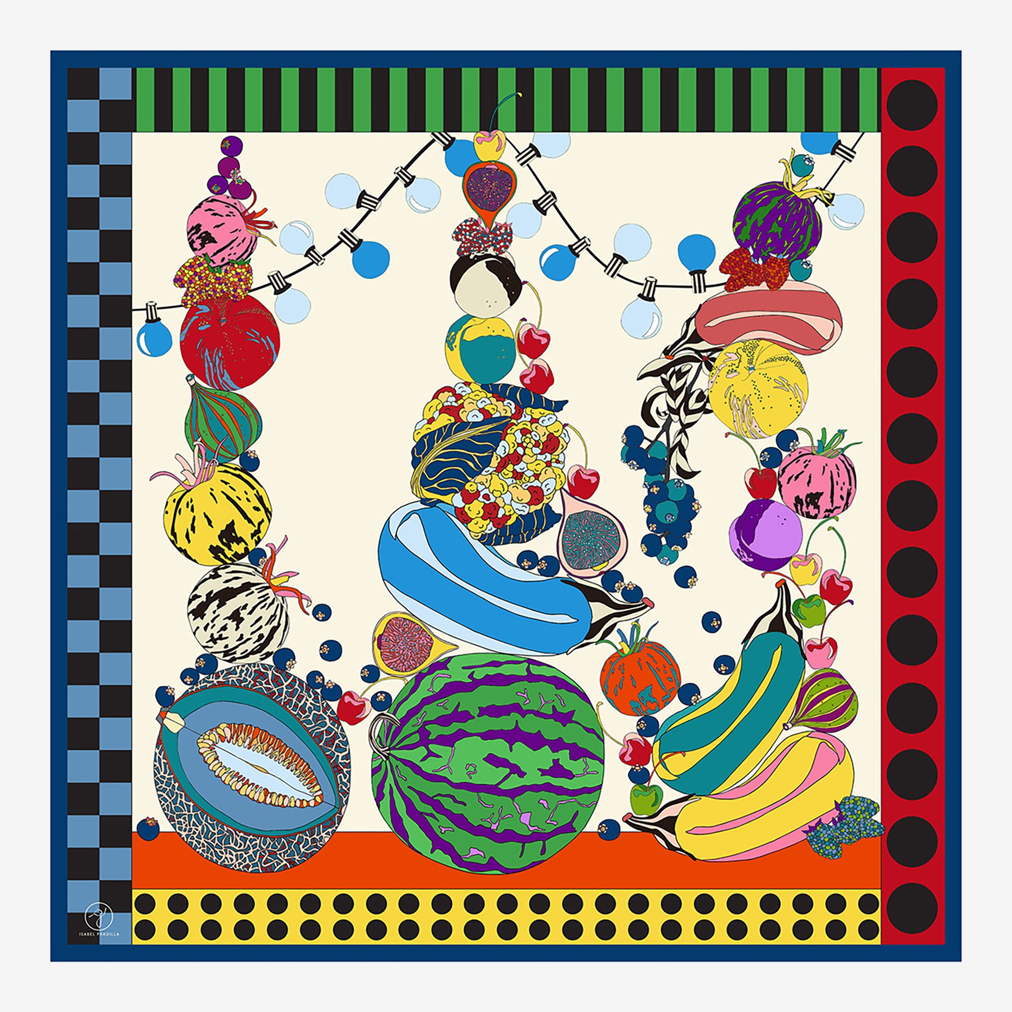 Inspired by Notus, the Greek god of the warm south wind, this scarf design captures the fleeting, sun-drenched essence of summer. Evoking the myth's golden breezes, it bursts with a bright, comic-inspired color palette, illustrating seasonal fruits and vegetables—vivid cherries, ripe tomatoes, and blushing peaches—all dancing in a playful whirlwind of color.