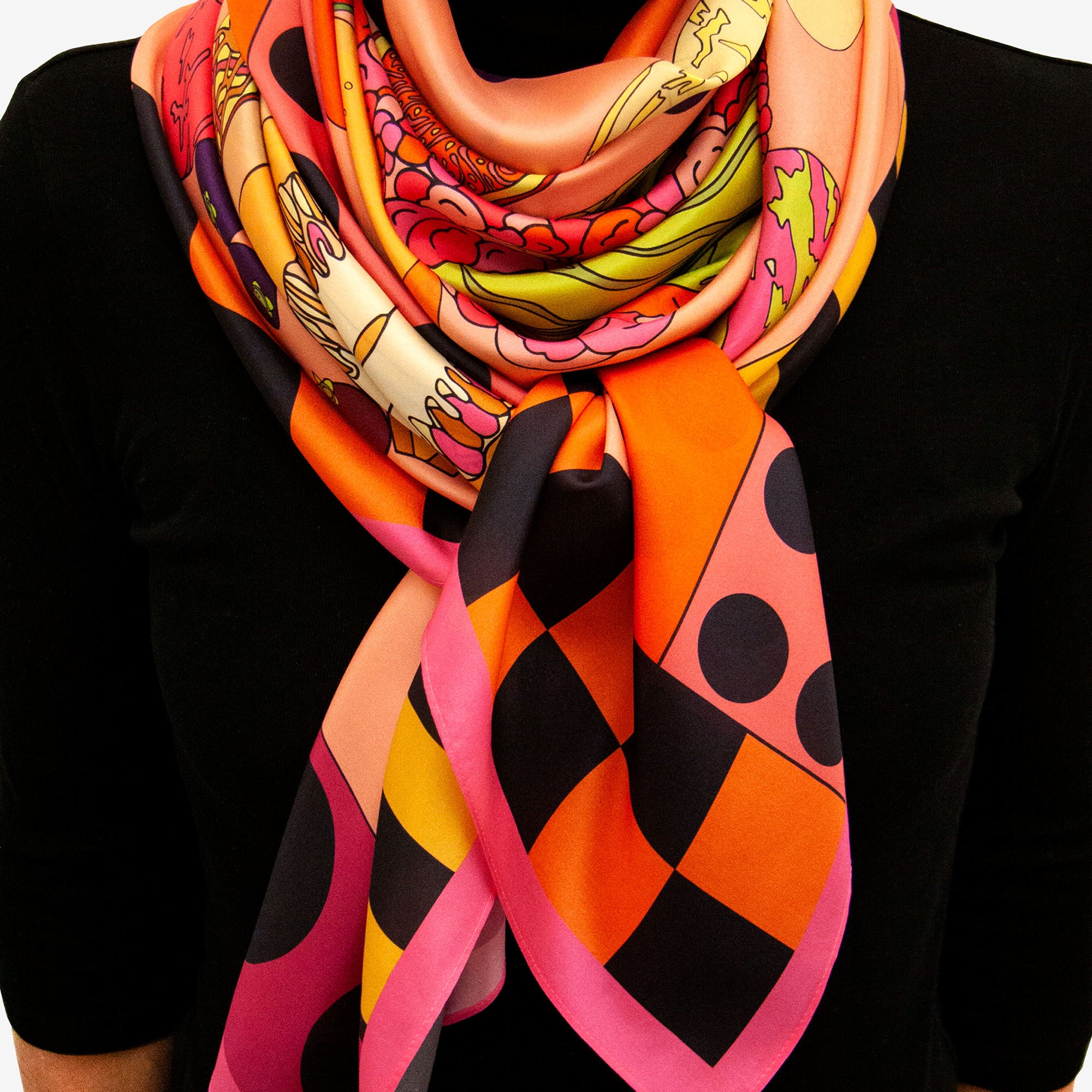 Inspired by Notus, the Greek god of the warm south wind, this scarf design captures the fleeting, sun-drenched essence of summer. Evoking the myth's golden breezes, it bursts with a radiant, high-summer palette—Peach Pink, Tangerine Orange, and Hot Pink—bringing to life seasonal fruits and vegetables like vivid cherries, ripe tomatoes, and blushing peaches, all swirling together in a playful whirlwind of color.