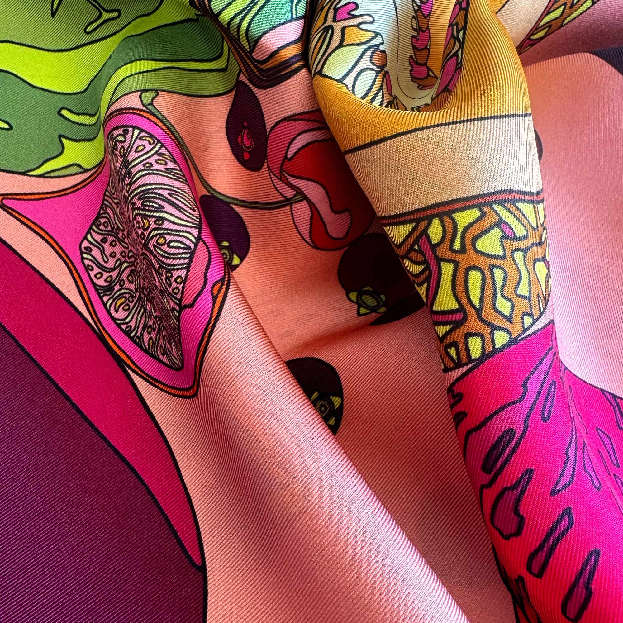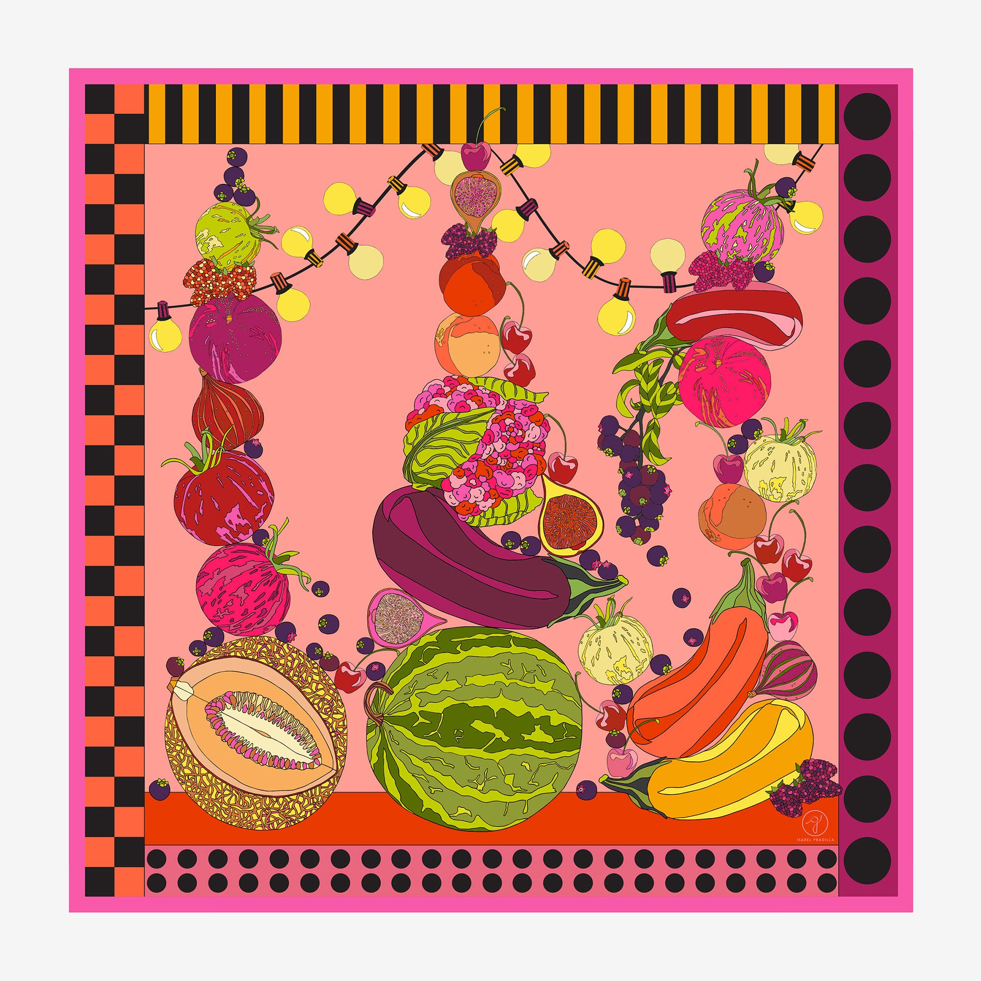 Inspired by Notus, the Greek god of the warm south wind, this scarf design captures the fleeting, sun-drenched essence of summer. Evoking the myth's golden breezes, it bursts with a radiant, high-summer palette—Peach Pink, Tangerine Orange, and Hot Pink—bringing to life seasonal fruits and vegetables like vivid cherries, ripe tomatoes, and blushing peaches, all swirling together in a playful whirlwind of color.