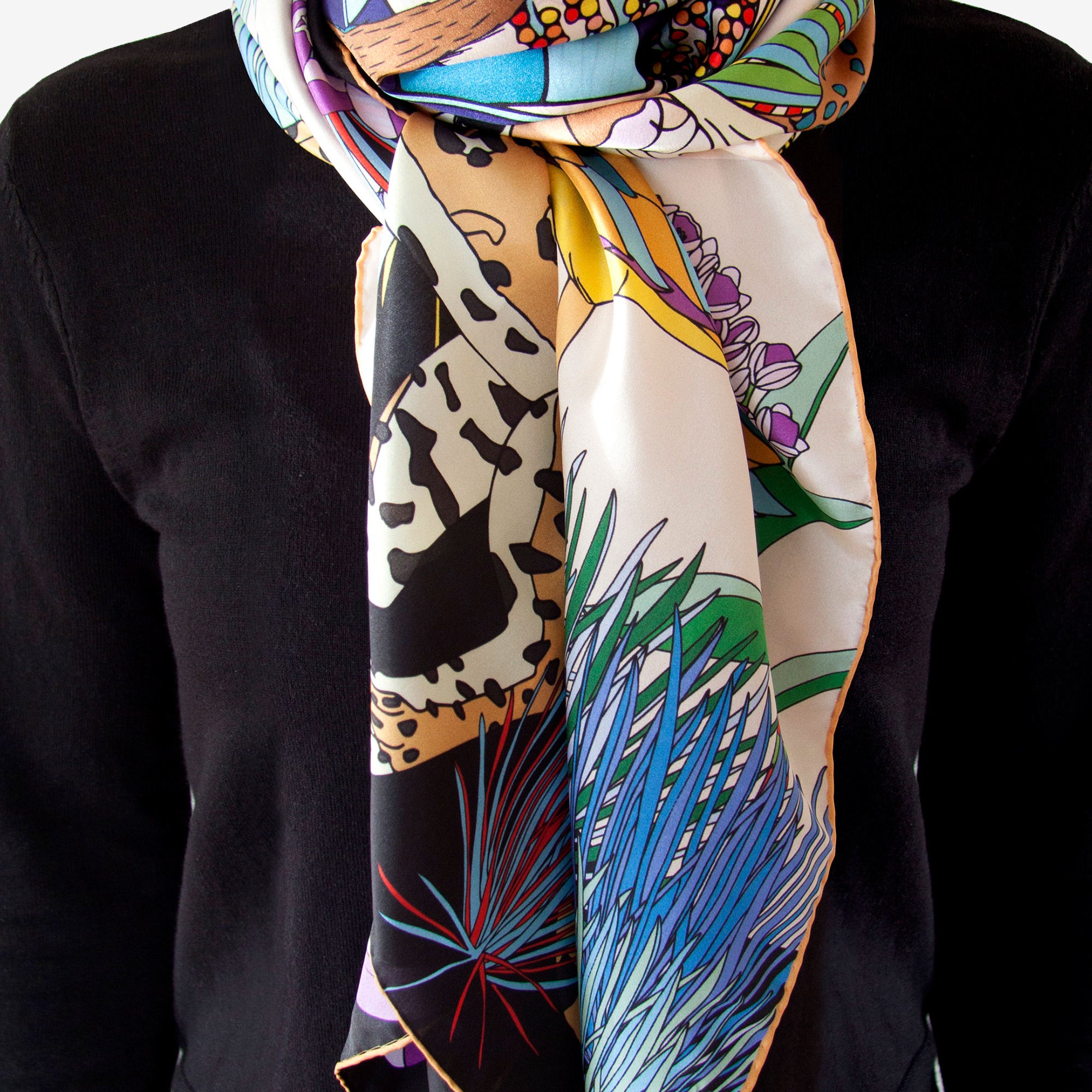 Printed on a generous 136x136cm square of lightweight silk habotai and crafted in the UK, this scarf drapes beautifully and invites versatile styling — perfect for layering or statement looks.