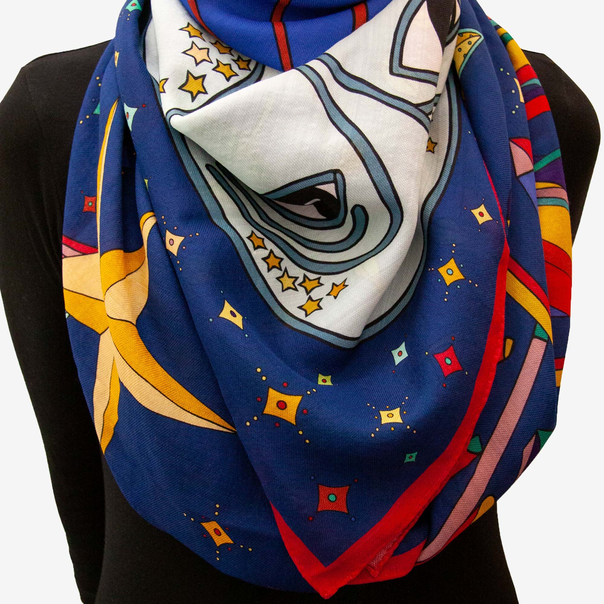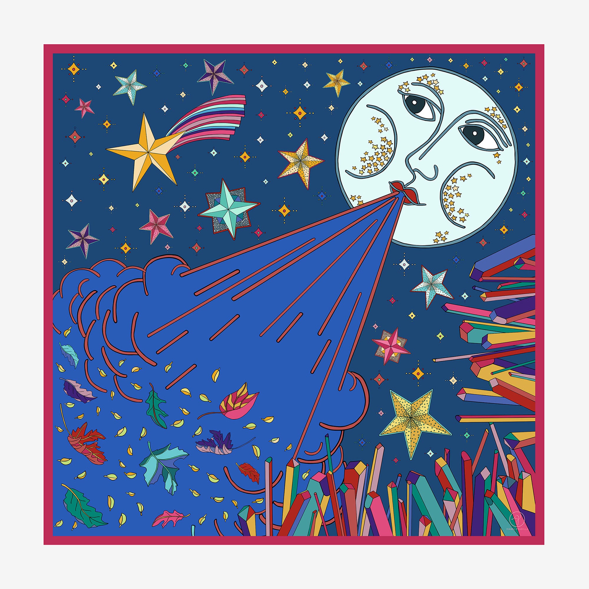 Inspired by Boreas, the Greek god of the cold north wind, this scarf design captures the brisk, stirring energy of late autumn’s arrival. Channeling the myth’s icy breath, it features a pale moon exhaling a chill that sends crisp leaves flying and delicate ice crystals forming. Rendered in a bold, wintry palette—Midnight Blue, Bright Blue, and vibrant Fuchsia—it evokes the electric stillness of the changing season in a swirling dance of wind and color.