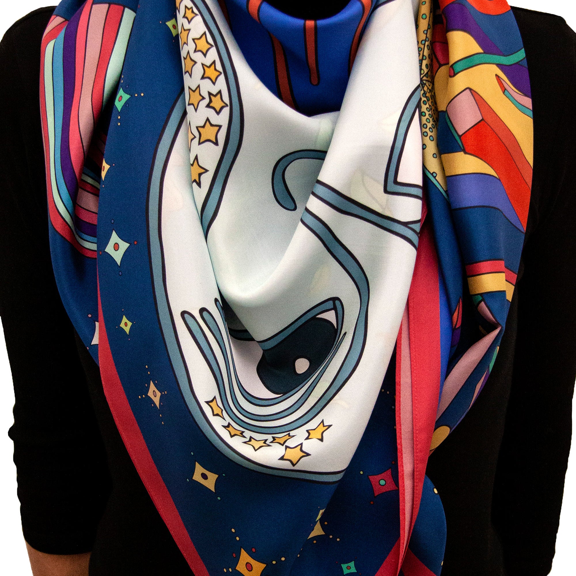 Crafted in the UK from 100% luxurious silk habotai in a generous 136x136cm format, this scarf offers effortless movement and endless styling possibilities — a contemporary take on silk, where bold color and playful design meet modern elegance.